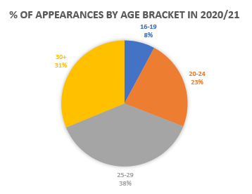 Reliance on older players has increased over the last five seasons with 2020/21 being the highest yet. Appearances made by players over 30 almost doubled between 2019/20 & 2020/21, from 17% to 31%, whilst appearances from U20s halved. The loss of Alfie Doughty first to injury and then Stoke has pushed this average age up further.