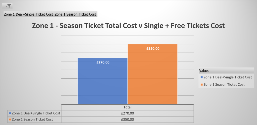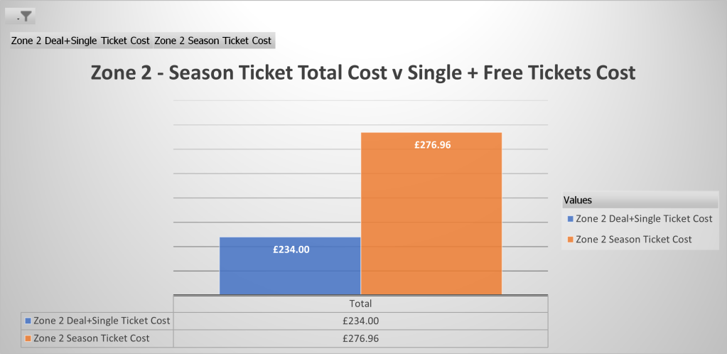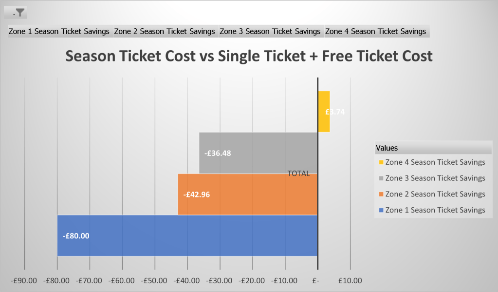 Based on single adult prices, you’d be better off without a season ticket in Zones 1, 2, and 3 so far this season, with only Zone 4 returning any sort of saving (£3.74).