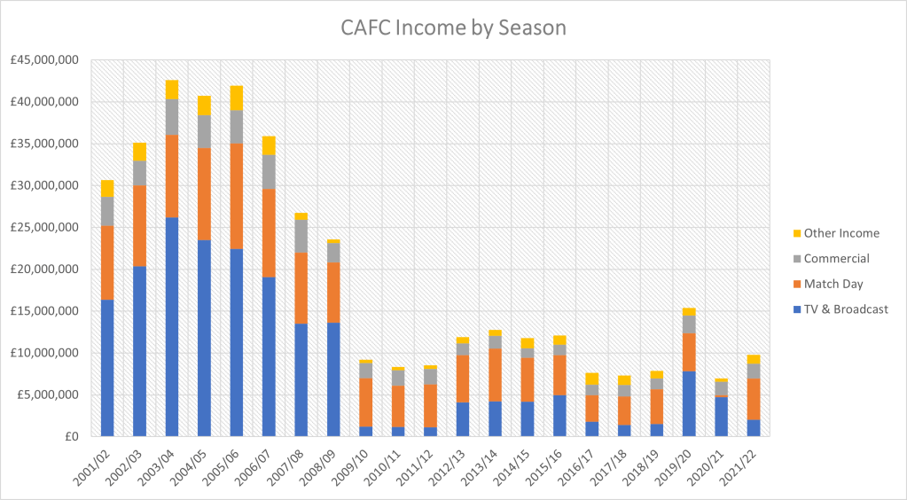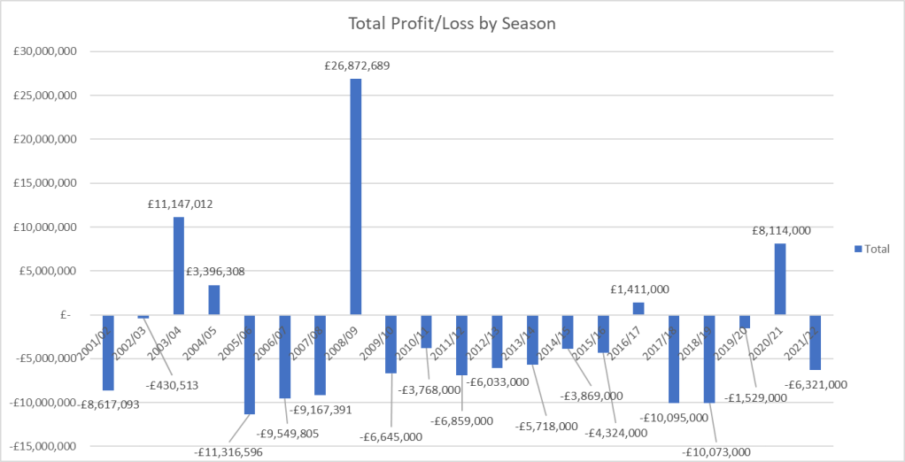 Charlton’s £9.79m turnover is the club’s largest ever in the third tier, a 24% higher total than the last time they were promoted back in 2019, and 14% higher than the 2012 promotion. However, contrary to Sandgaard’s previous comments about “Project Breakeven”, it seems unlikely that Charlton can push turnover much higher without success in the form of promotion to the Championship. After all, the TV rights alone are almost four times higher in the Championship than in League One. It is therefore no coincidence that Charlton’s turnover was 36% lower than the 2019/20 total, the financial gulf between the two divisions is vast and is getting larger.