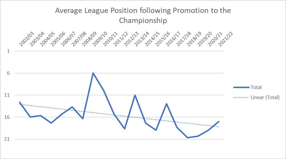 If Charlton were to achieve promotion, then staying up would be an achievement in itself as promoted teams are finding this more difficult than before. Between 2017 and 2022, the mean league position for a promoted team was 19th, three places lower than 2012-17 (16th) and seven lower than the 2007-12 (12th). To reduce this gap, promoted teams must unsustainably throw more money than ever at playing budgets, something that is far easier said than done.